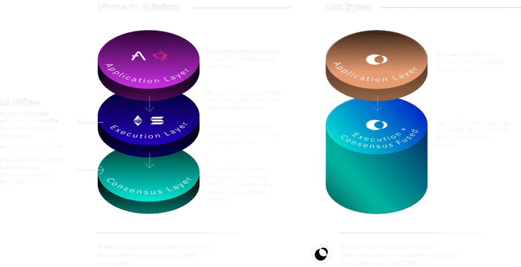 Legacy blockchains keep them separate — code runs first, consensus checks later. Reality verifies every computation as it happens.