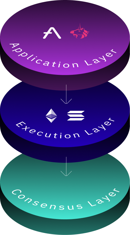 User-facing apps submit transactions, but execution and finality happen in deeper layers